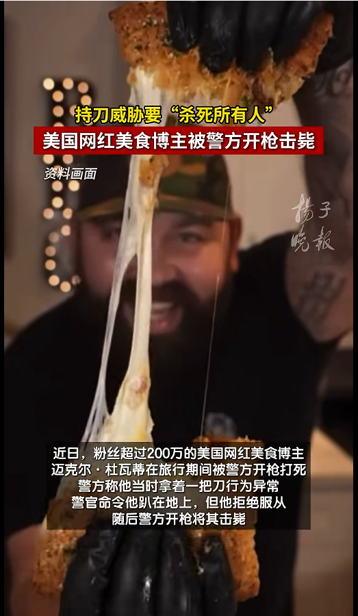 11月13日,据扬子晚报,粉丝超过200万的美国网红美食博主迈克尔·杜瓦蒂旅行期间被警方开枪打死。警方称他当时拿着一把刀行为异常,警官命令他趴在地上,但他拒绝服从,随后警方开枪将其击毙。