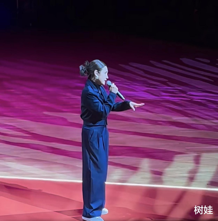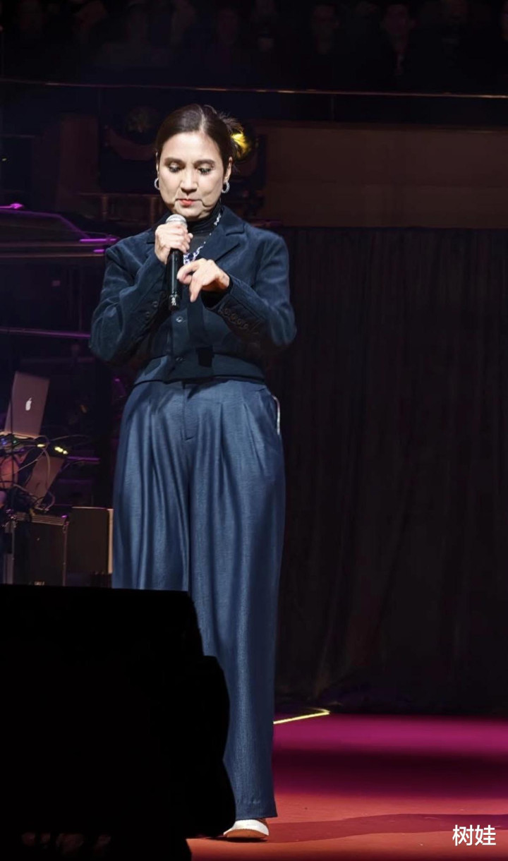 64岁的戚美珍当晚精心打扮了一番,因为要登台演出,所以穿着显得隆重——一身深蓝色,上身是蓝黑色的收腰小西装,下身是亮面质感的阔腿裤,胸前还挂了一串闪耀的钻石珠宝,贵气十足。戚美珍已经不复当年勇,如今她身材发福,有肉眼可见的皱纹,面部也显得松弛,而她穿了阔腿裤,以及收腰的衣服,大概也是为了遮掩身材上的不足。不过客观来说,她个人的状态还不错,认真打扮了一番之后,气质还是出众的,依然能够感受得到当年的风采,形容起来她就是优雅地老去了,状态真实。